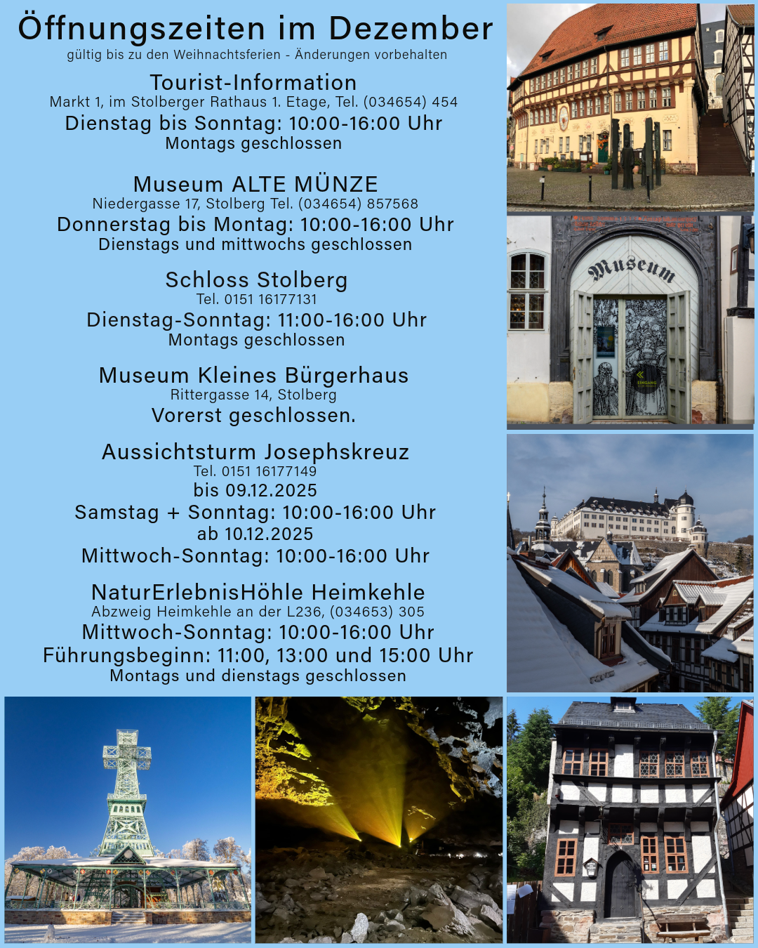 Geänderte Öffnungszeiten der touristischen und musealen Einrichtungen der Gemeinde Südharz bis zu den Weihnachtsferien!